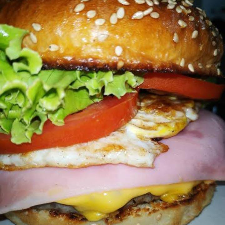 150gr. De carne de res sirloin, queso americano, tocino, lechuga, tomate, cebolla, mayonesa y catsup.