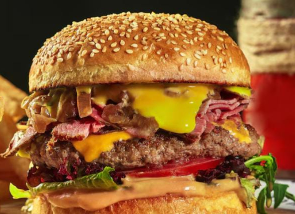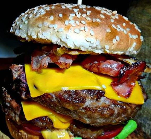 150gr. De carne sirloin de res,carne picada de arrachera, queso americano, tocino, lechuga, tomate, cebolla, mayonesa y catsup.