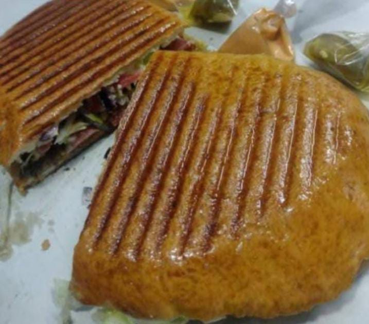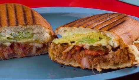 Torta grande rellena de pierna,asada sirloin , chorizo, milanesa empanizada, queso americano, BBQ,frijol, mayonesa, lechuga, cebolla, media crema y queso.