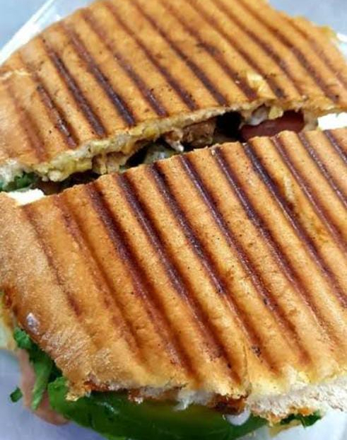 Torta grande rellena de pierna horneada, milanesa empanizada, chorizo, queso Oaxaca, frijol, mayonesa, lechuga, cebolla, media crema, queso y catsup.