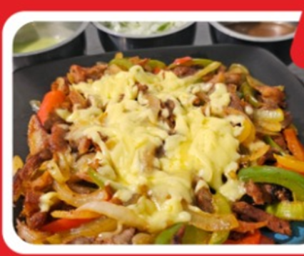 Deliciosa carne al Pastor con pimiento morrón y cebolla asada, con queso gouda gratinado; acompañado de tortillas de maíz.