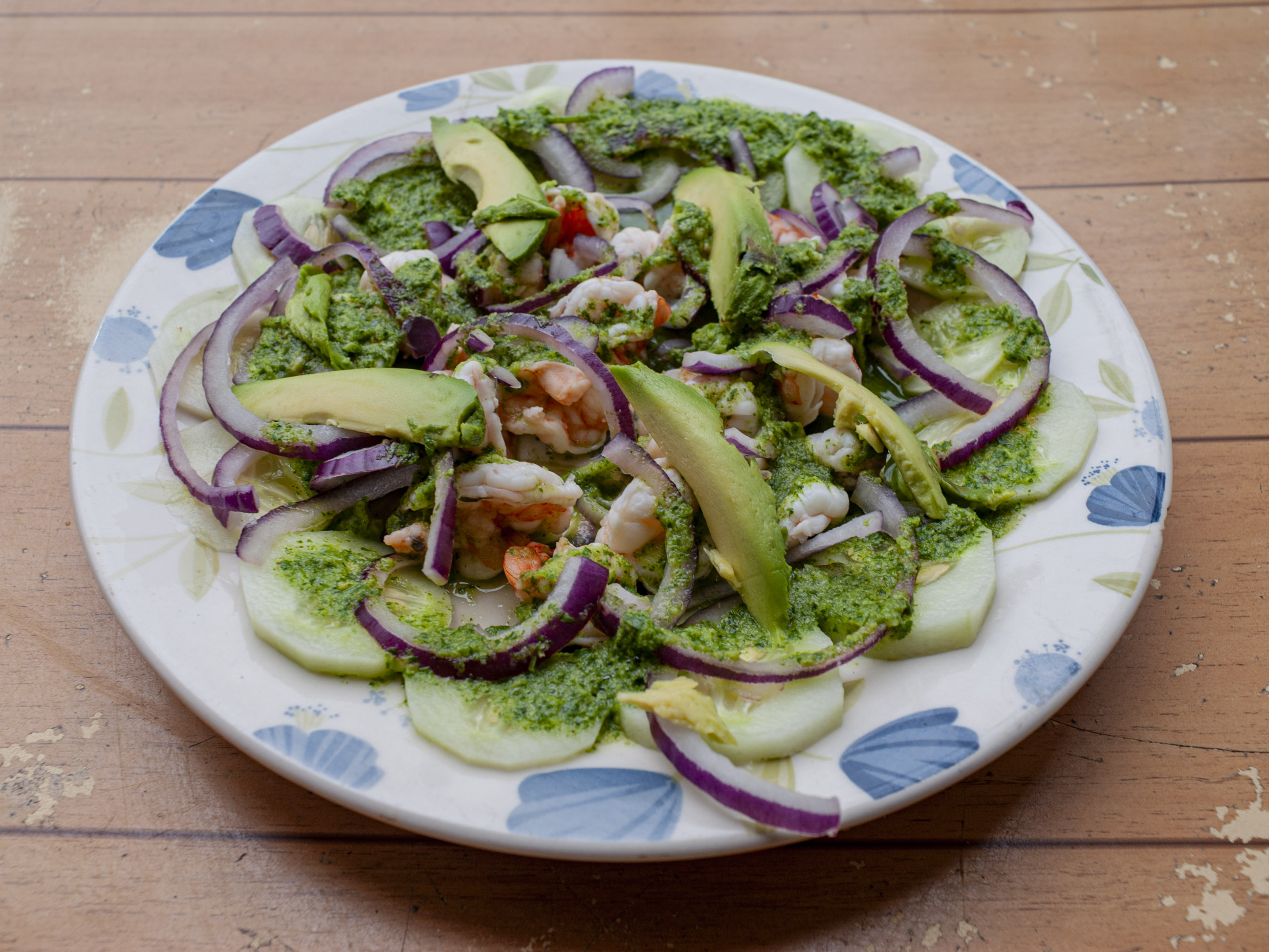 Camarones sobre una cama de pepinos, rabanos, cebolla morada con la salsa de aguachile de la casa..