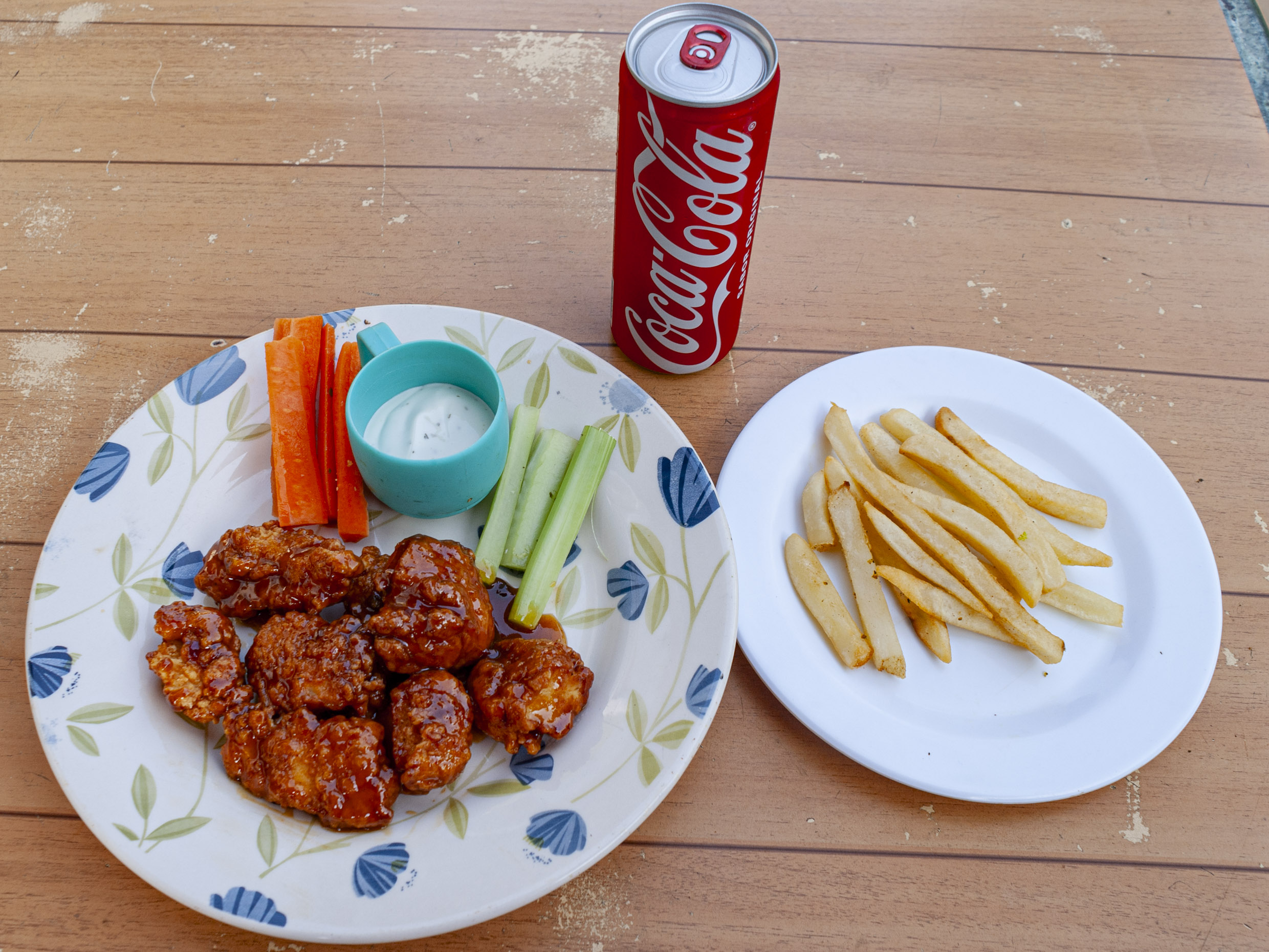 355 Ml*2 + Papas a la Francesa*1 + 16 Pzas bañadas en salsa, con aderezo ranch y apio y zanahoria