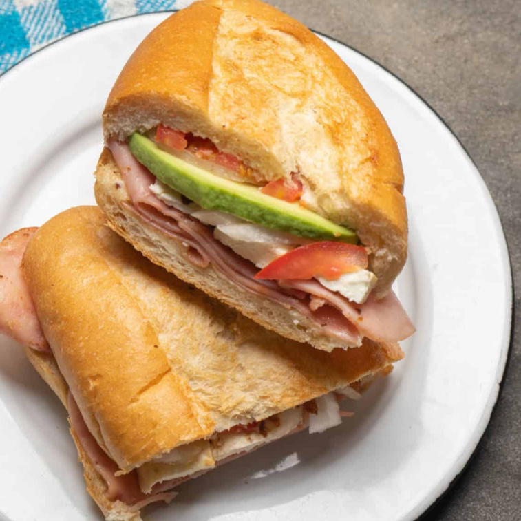 Deliciosa Torta de bolillo de jamón con frijol lechuga mayonesa quesos cebolla