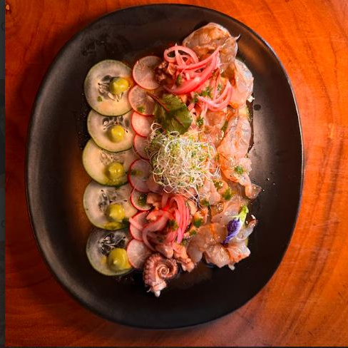 Ceviche de pescado macerado en jugo de limón acompañado de pulpo y camarones cocidos, bañados con salsa agridulce, acompañado de dos tostadas de maíz crujiente