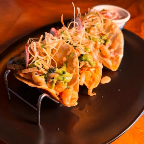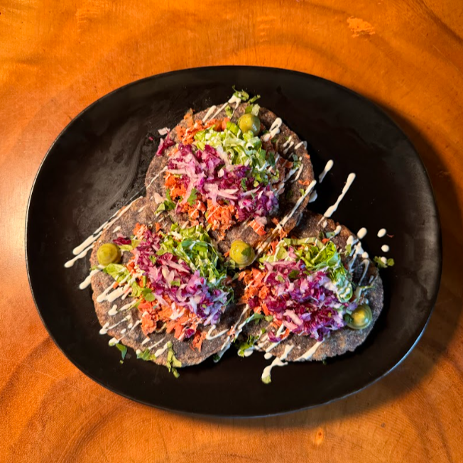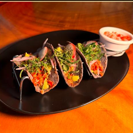 3 Tacos de tortilla de maíz azul con atún guisado, aderezados con cremoso de aguacate. acompañado con cebolla curtida, ensalada mixta y pico de gallo. 3 unidades