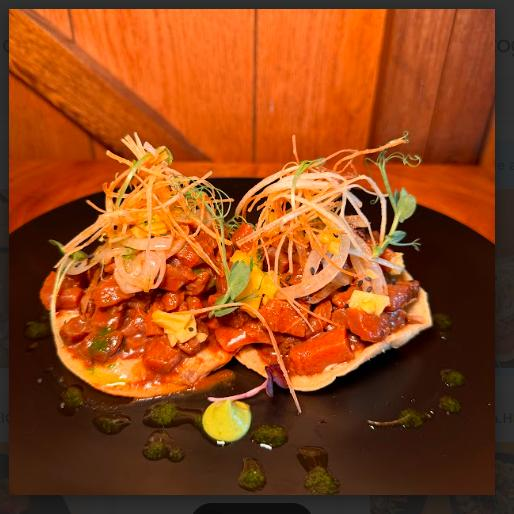 Montadito de atún marinado con salsa marisquera y aceite de oliva especiado, servido sobre tostadas, acompañado de trocitos de mango fresco.