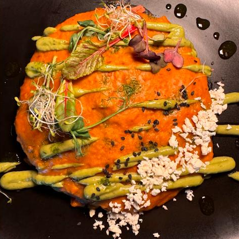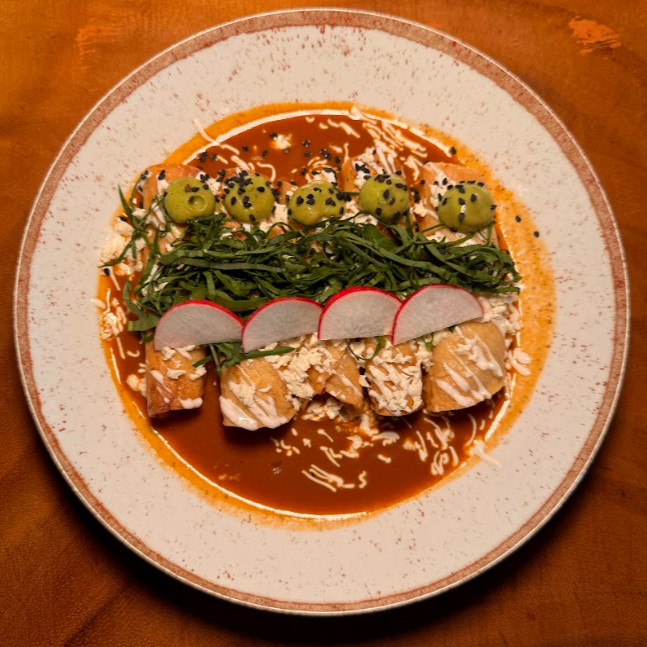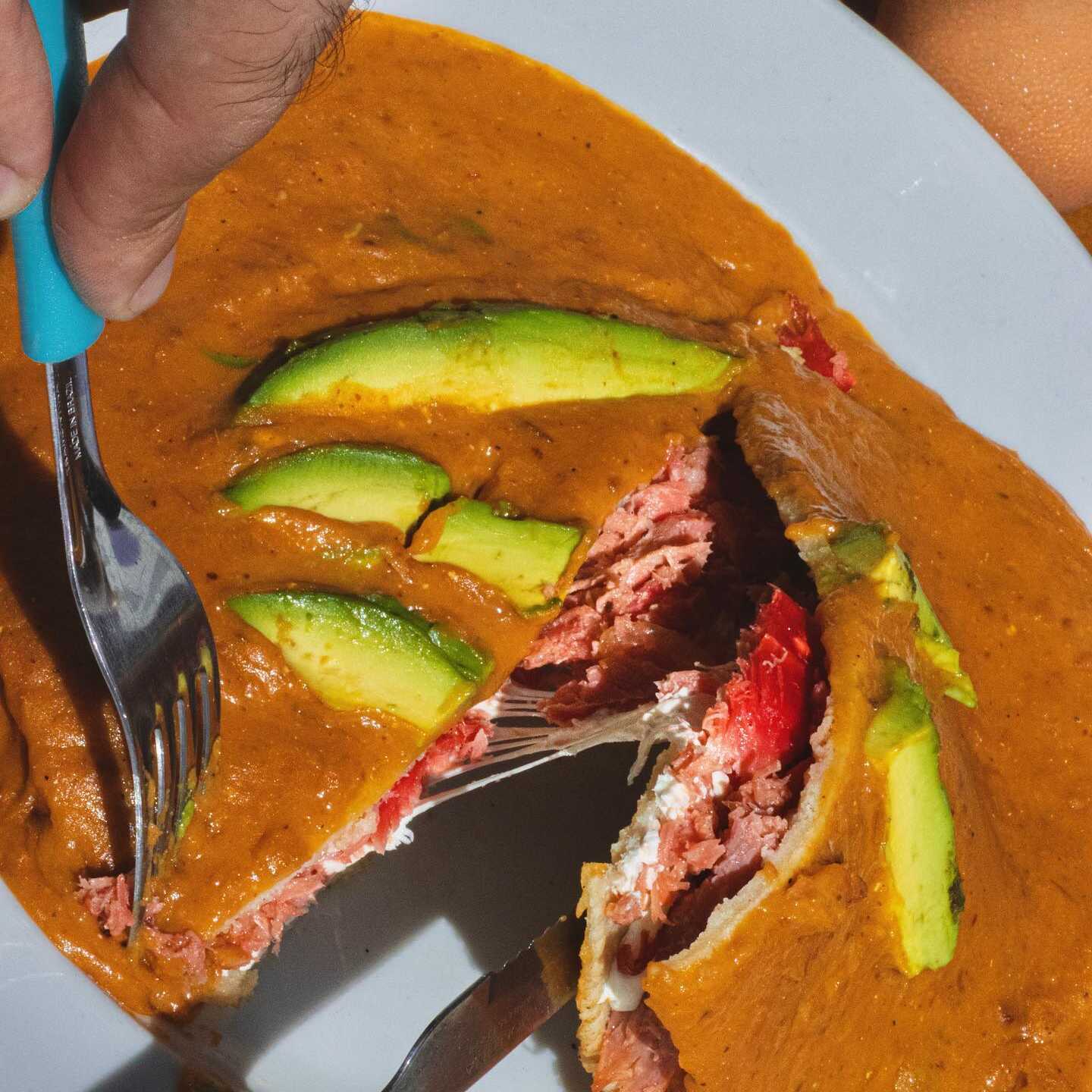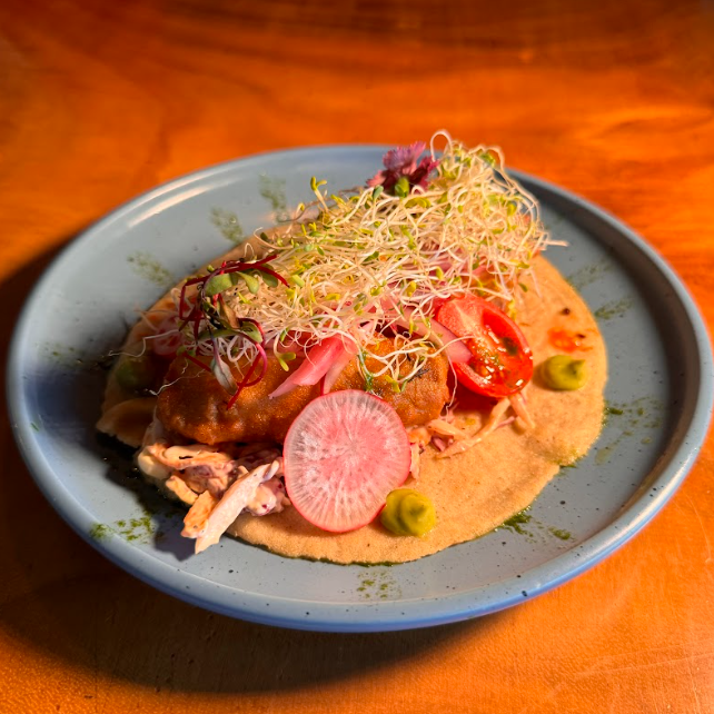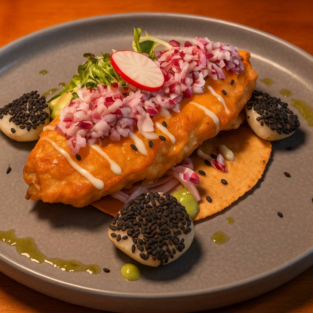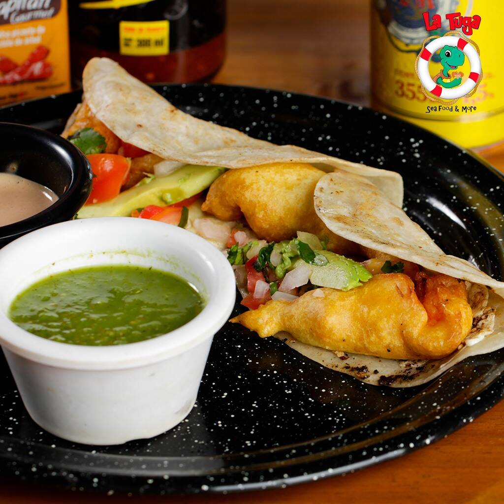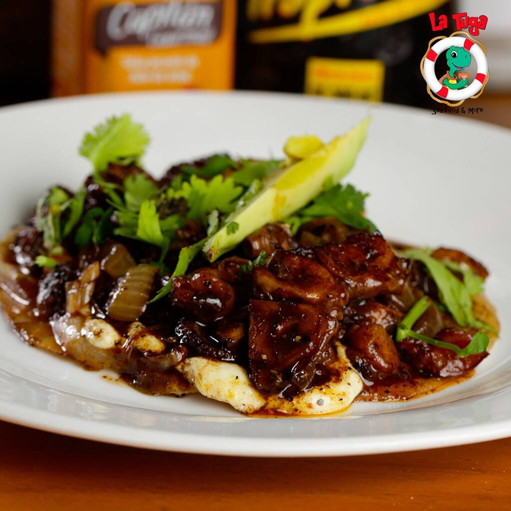 Tuga de maíz, rellena de marlín guisado, camarón guisado y queso asadero, bañado en salsa de frijoles puercos y aderezado de cremoso de aguacate, ajonjolí y queso doble crema.