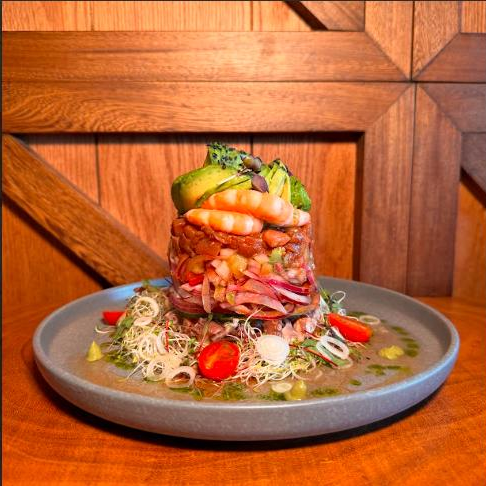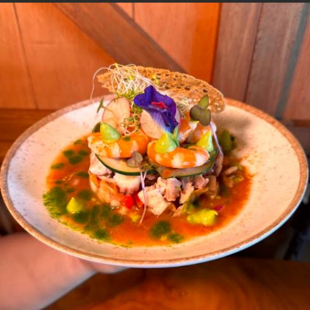 Torre de mariscos que combina atún macerado, pulpo cocido, ceviche de pescado, camarón cocido, pepino y cebolla, servido con salsa de la Tuga y coronado con un abanico de aguacate