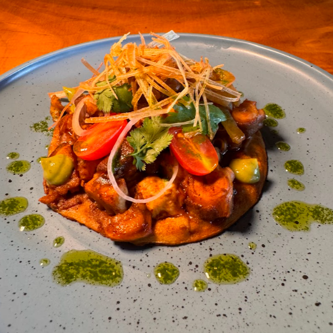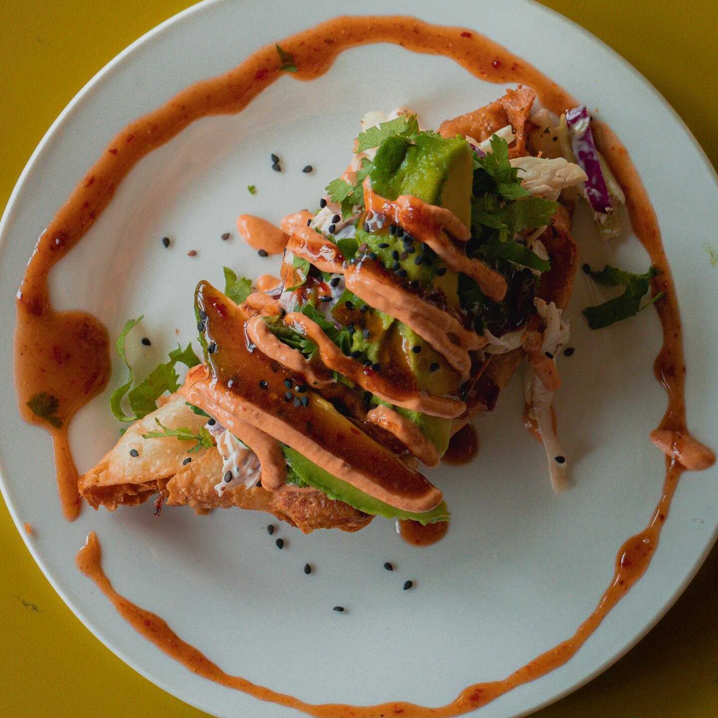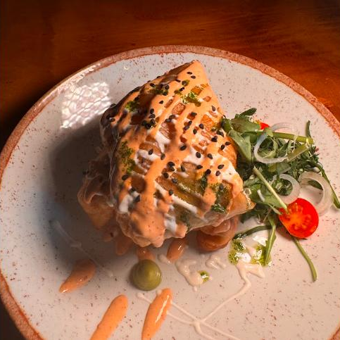 Tortilla de harina frita, rellena de pulpo y camarón cocido, aderezado con mayochipotle y salsa de tamarindo acompañado de ensalada de col.