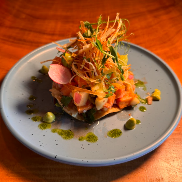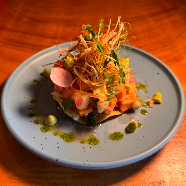 Ceviche de pescado sobre una tostada de maíz crujiente