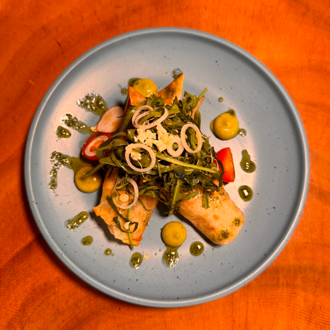 Flautas de marlín guisado, aderezada con crema y queso en fondo de marisco. 5 unidades