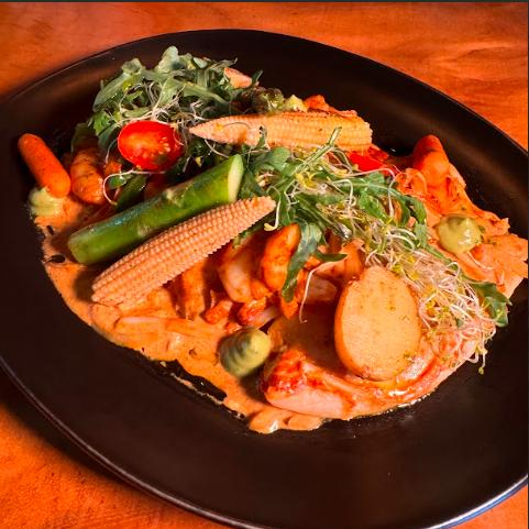 Pulpo aderezado en pasta zarandeada, acompañado de ensalada y mix de verduras