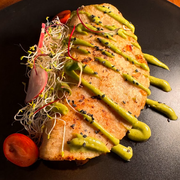 Quesadilla rellena de marlín salteado y queso asadero, con un toque de cremoso de aguacate en tortilla de maíz