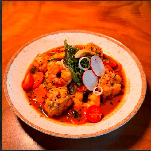 Albóndigas de camarón sobre un caldo de mariscos, acompañado de arroz y mix de verduras.