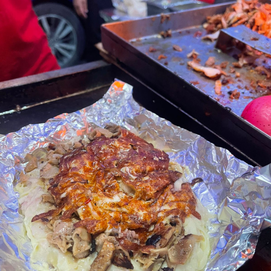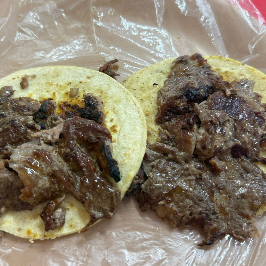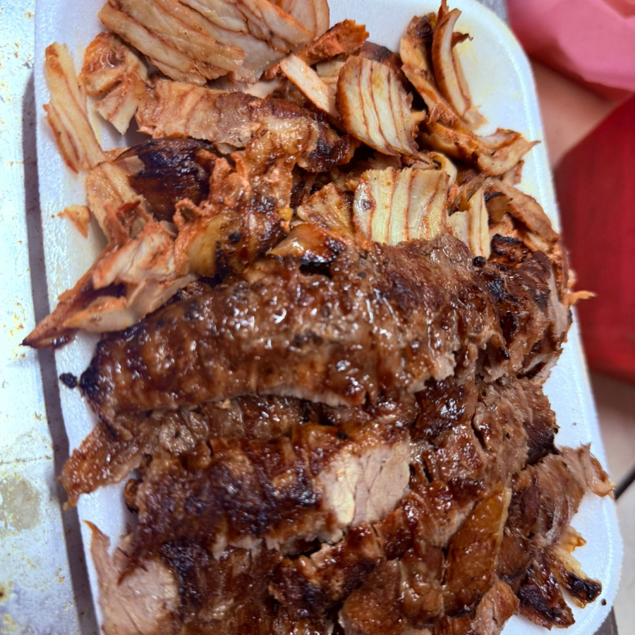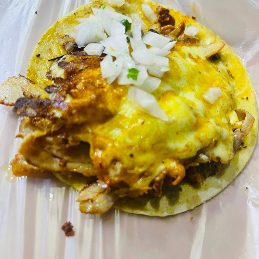 Mezcla de carnes, tripa, pastor, longaniza, asada con queso, cebolla asada y pimiento morron