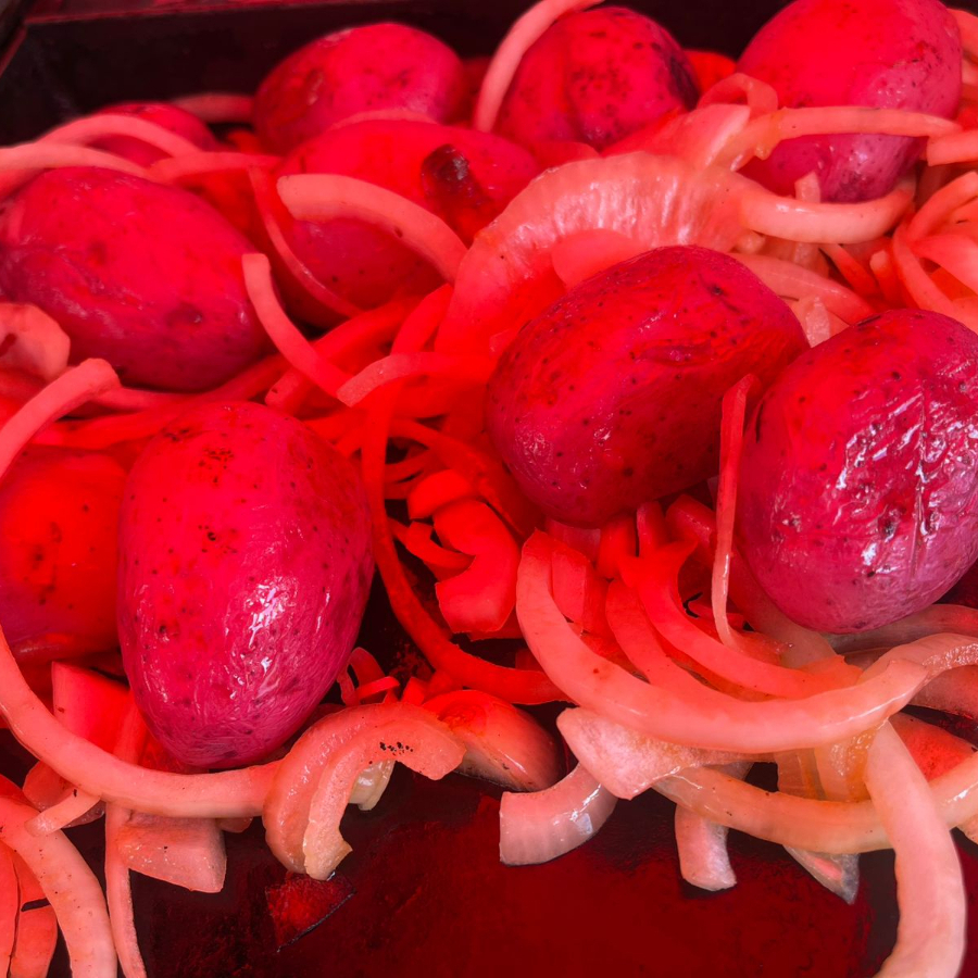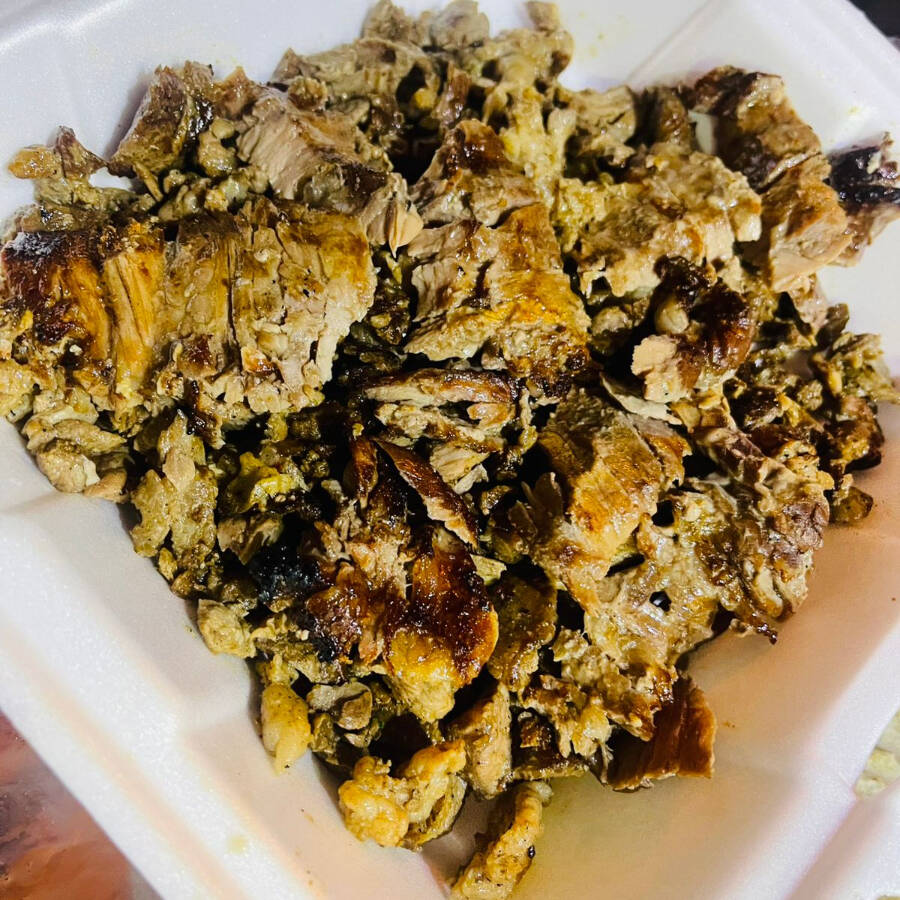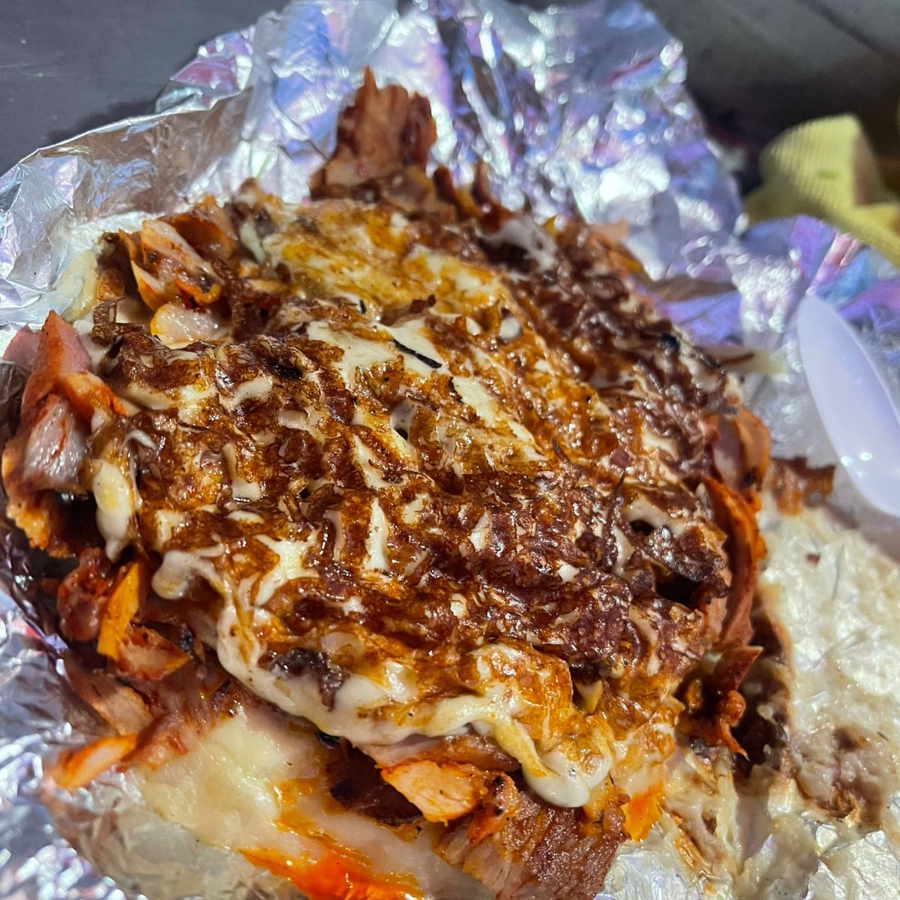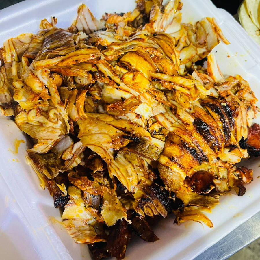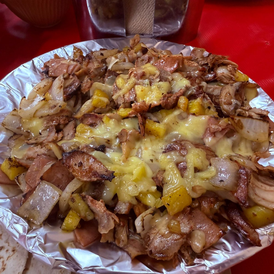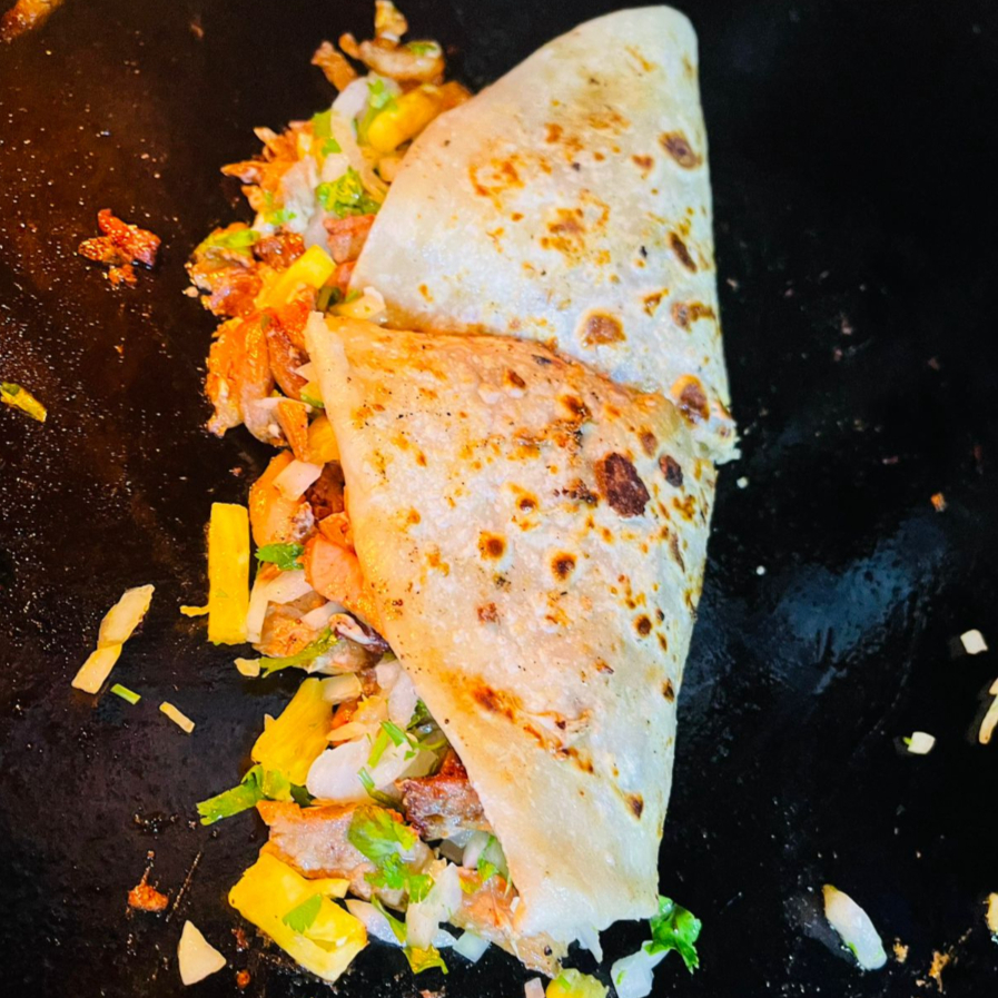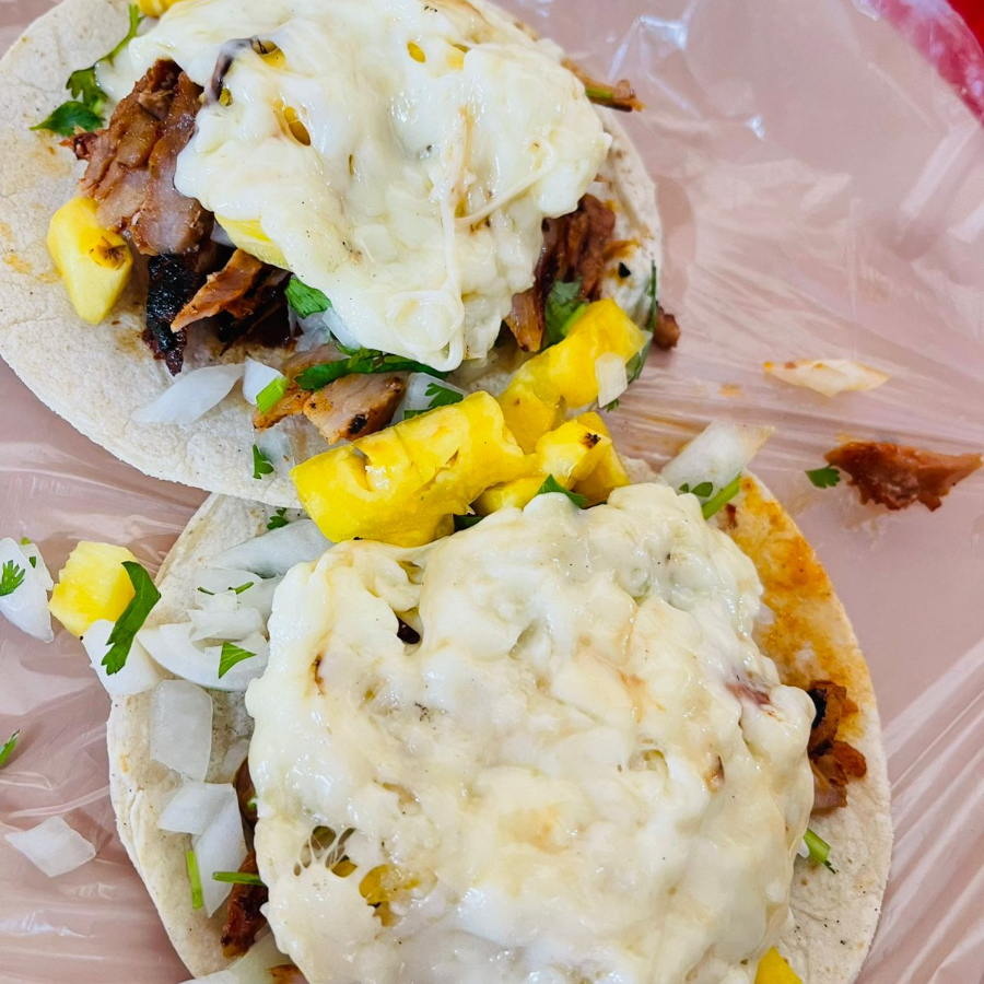 250 gramos de carne, con una capa de queso gratinado encima, incluye piña, cebolla asada, cebolla con cilantro y tortillas
