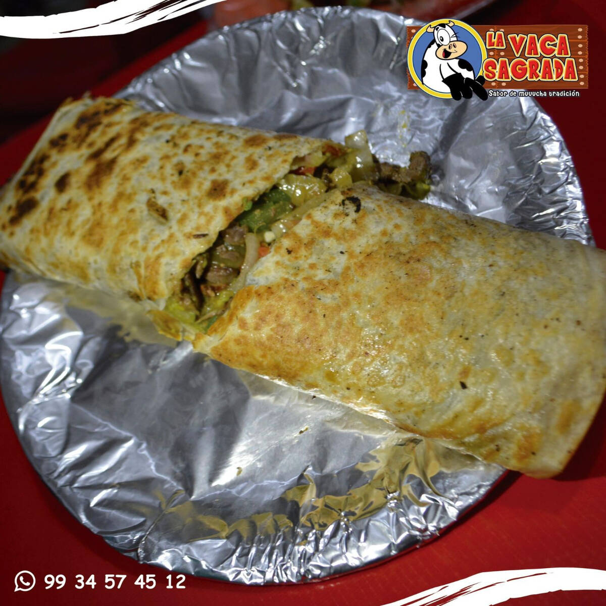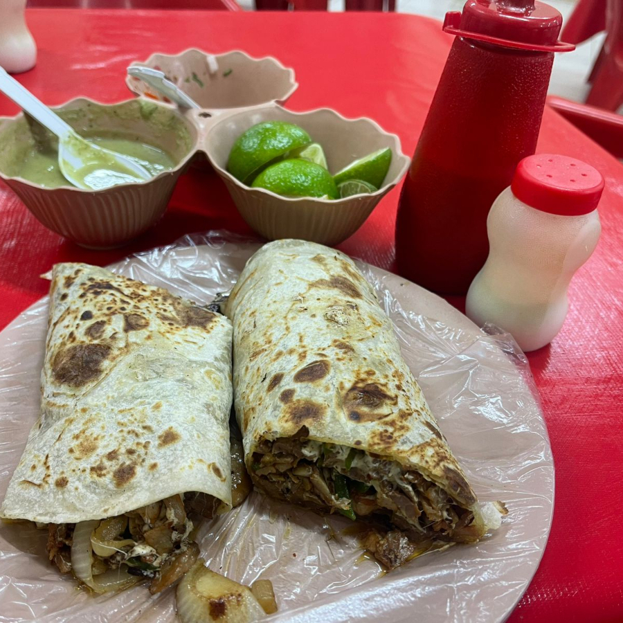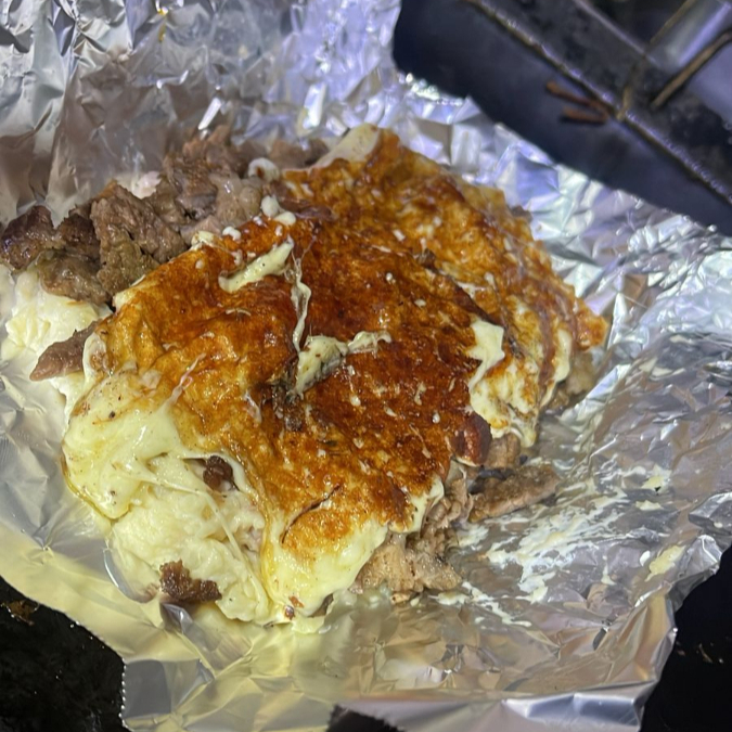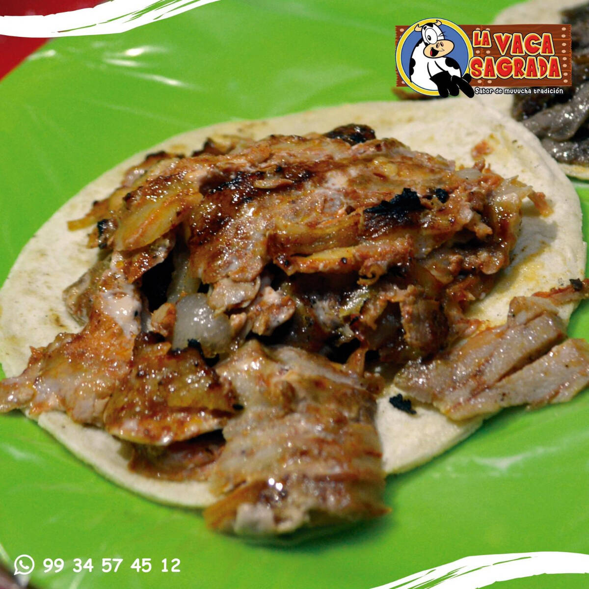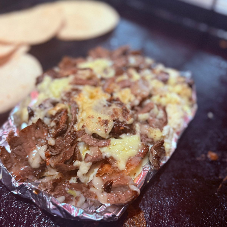 250 gramos de carne, con una capa de queso gratinado encima, incluye cebolla asada, cebolla con cilantro y tortillas