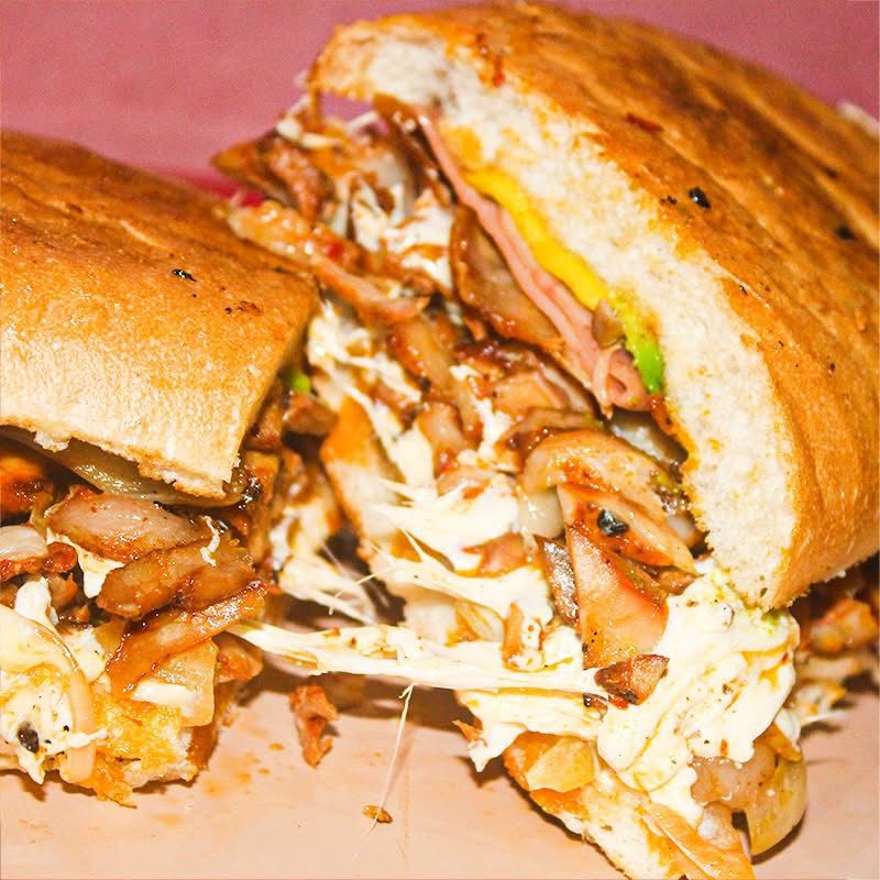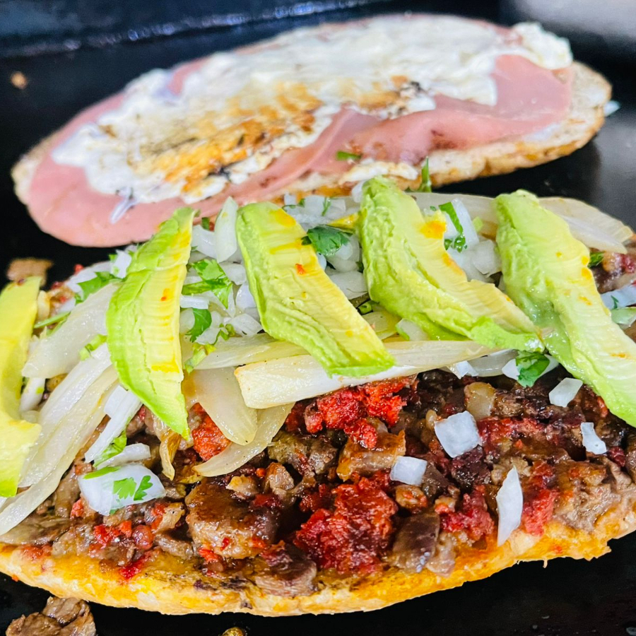 Elaborada con aguacate, cebolla asada, jamón, mayonesa, queso y carne asada con longaniza