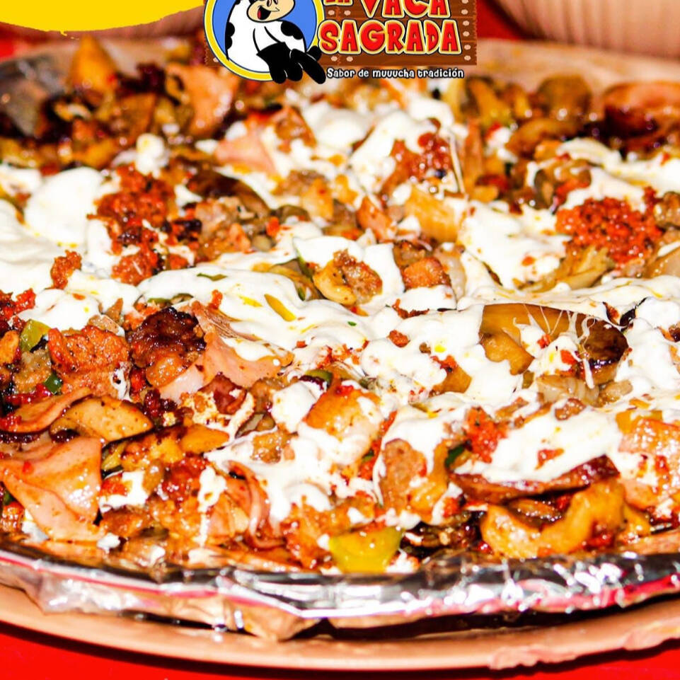 Champiñones, pimiento morron, cebolla asada, jamon, queso y carne asada con longaniza