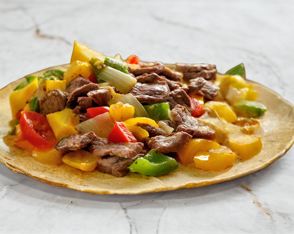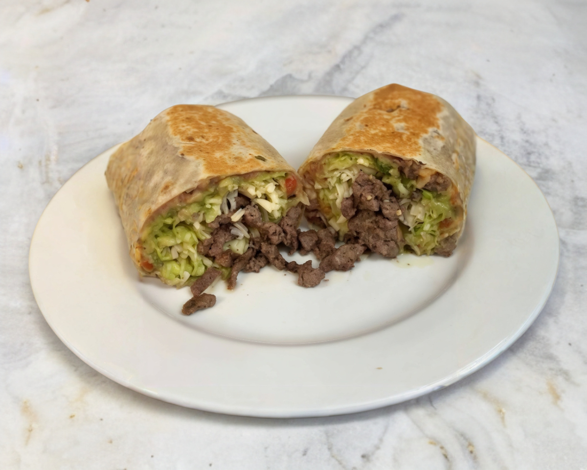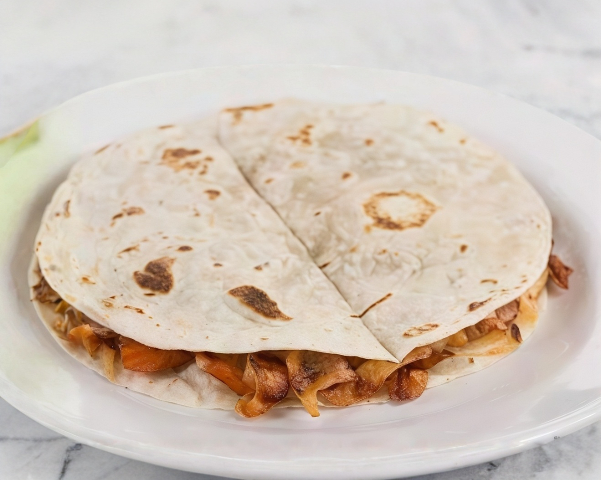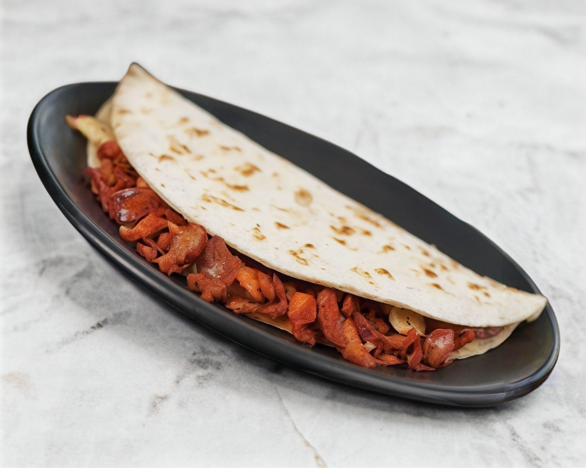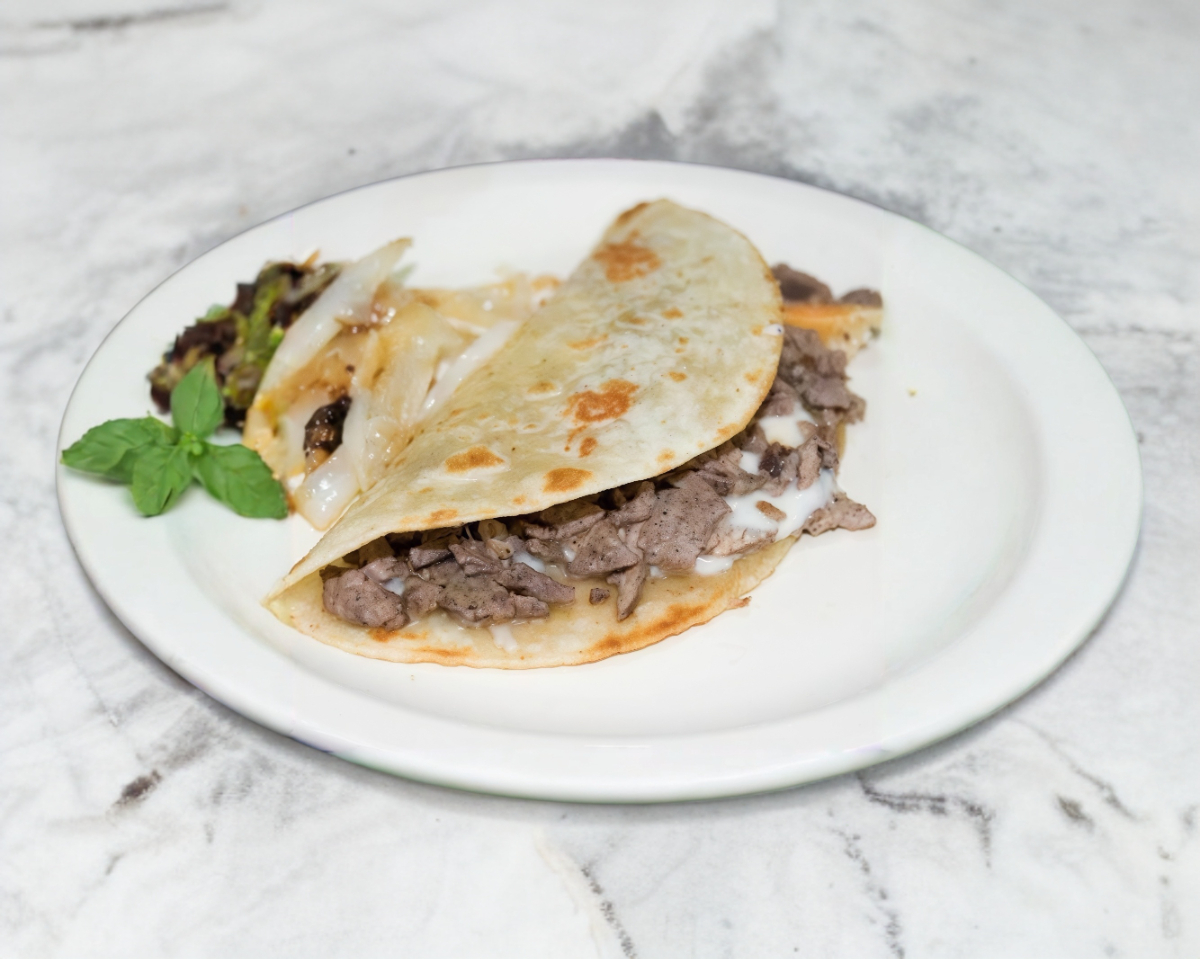 Gringa de asada de res acompañada de cebolla, cilantro y salsas.