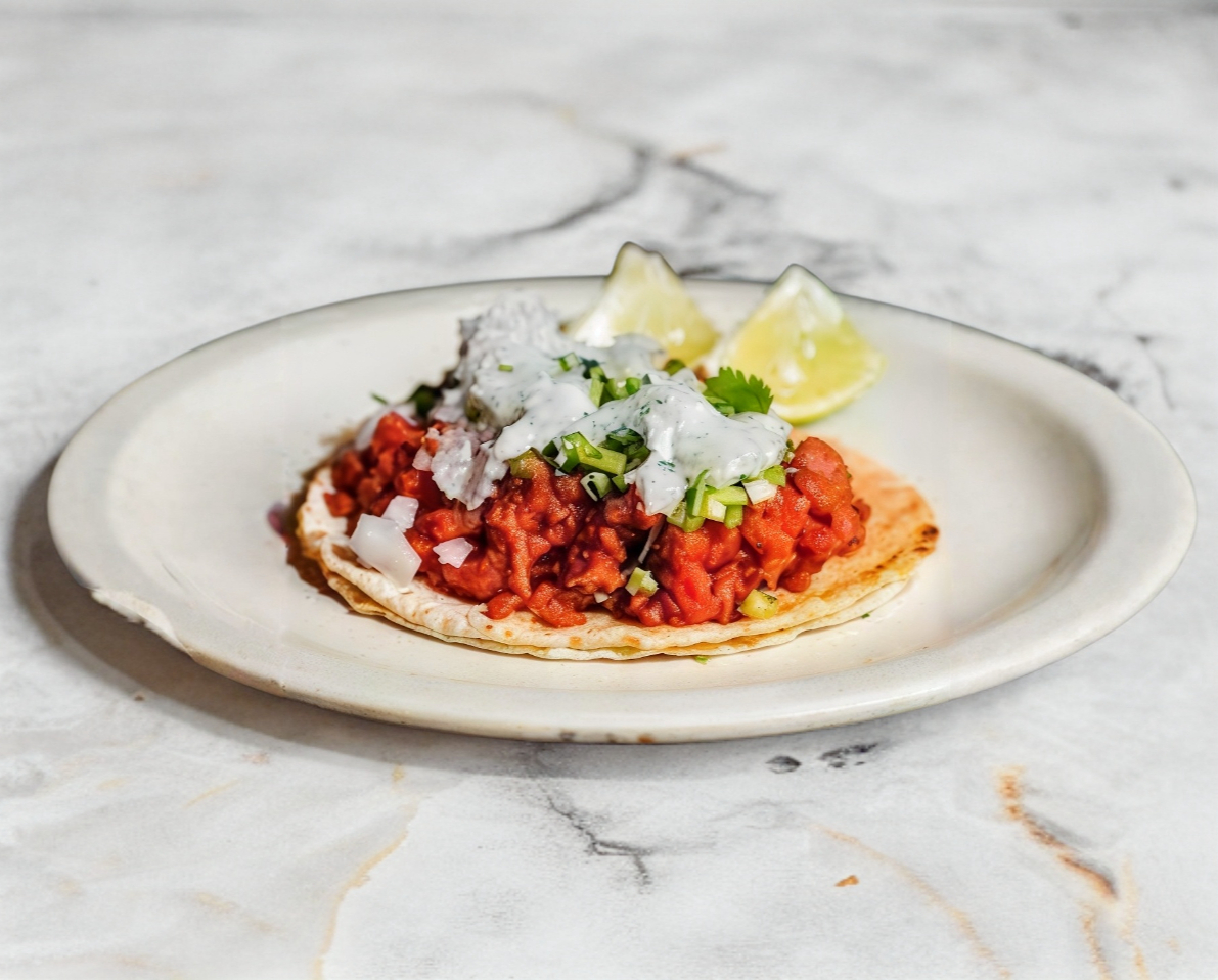 Taco campechaneado acompañado cebolla con cilantro, salsa verde, limones, salsas mexicana.