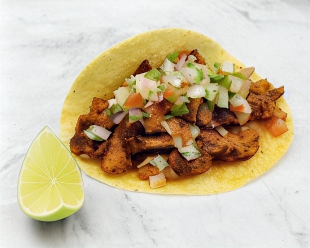 Taco de longaniza de res acompañado cebolla con cilantro, salsa verde, limones, salsas mexicana.