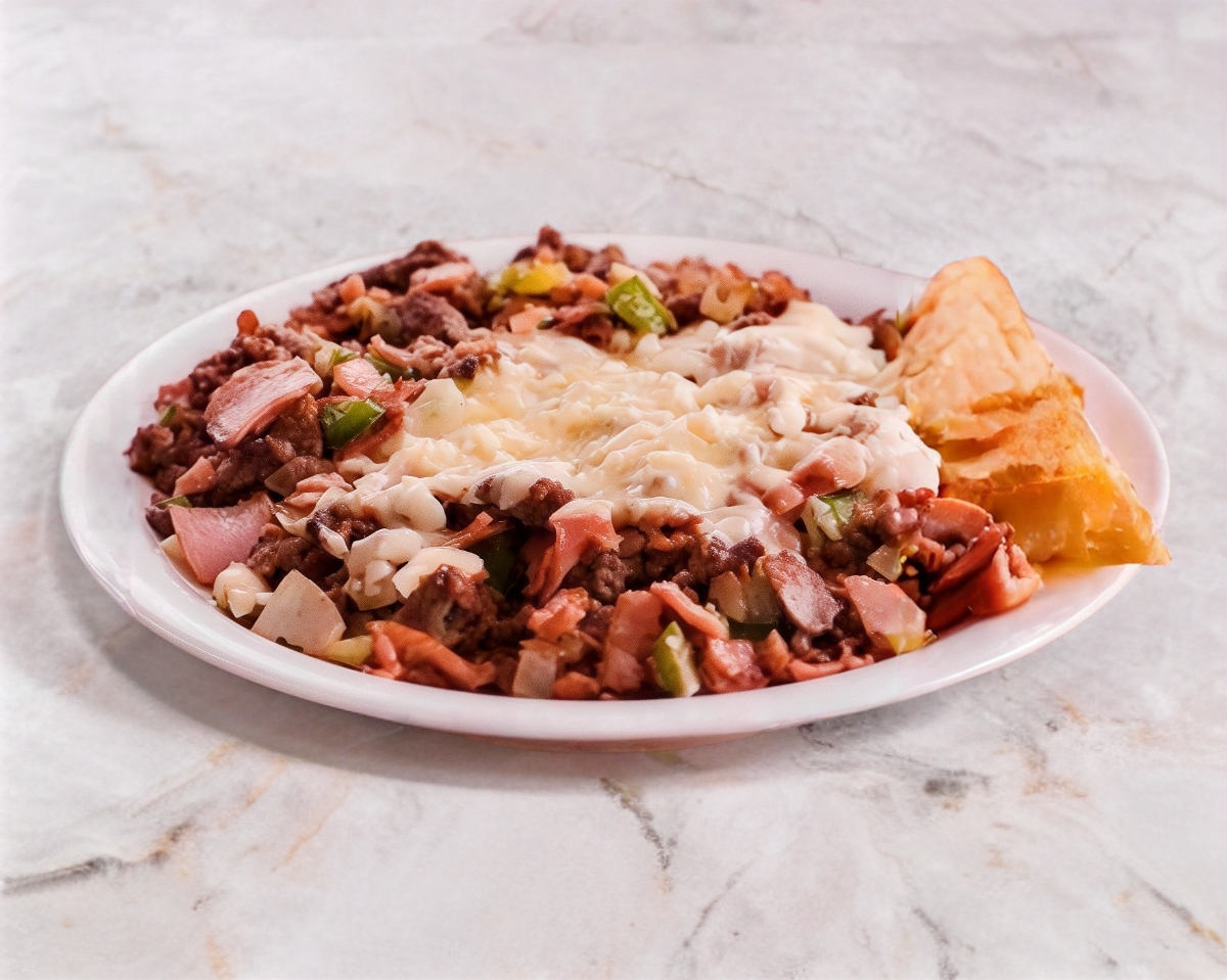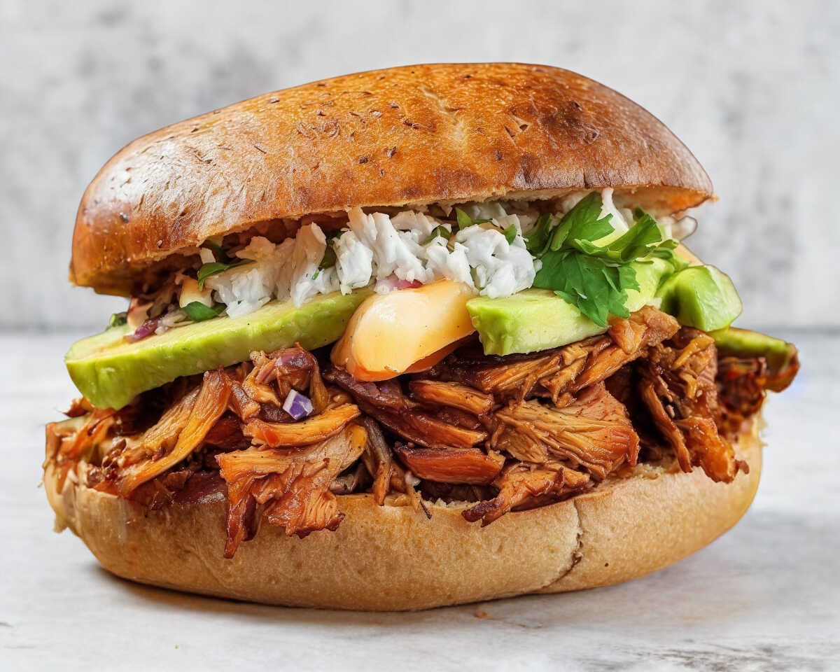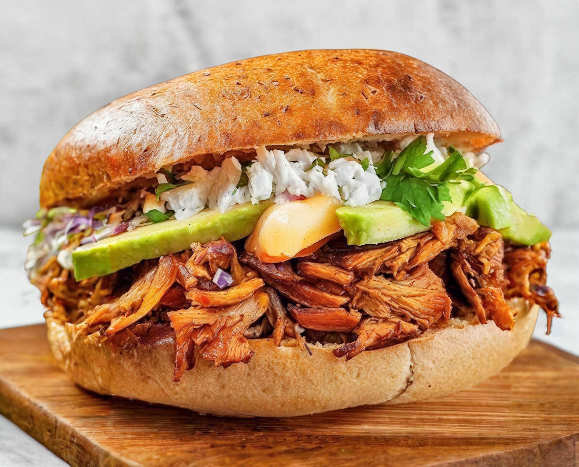 Torta de carne al pastor con queso, jamon, aguacate, tomate y lechuga