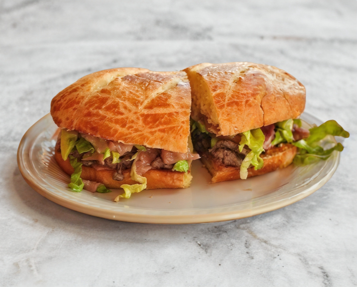 Torta de carne asada con queso, tomate, lechuga, aguacate y jamon