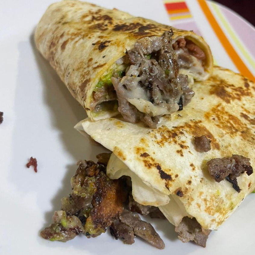 Tortilla de harina rellena de carne de res asada, jamon, tocino, rebanadas de aguacate, lechuga y bañada en frijoles charros.