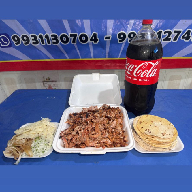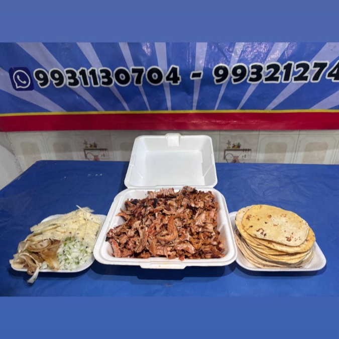 1 Kilo de pastor acompañado de 1 kilo de tortilla, salsa verde, salsa mexicana, cebolla asada, piña en rebanadas y cilantro y cebolla.