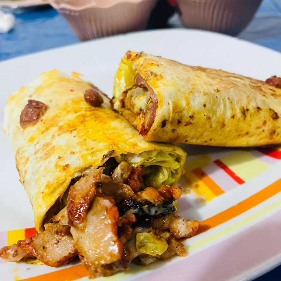 Mega tortilla de Harina rellena de carne al pastor, jamon, tocino, rebanadas de aguacate, lechuga y bañado en frijoles charros