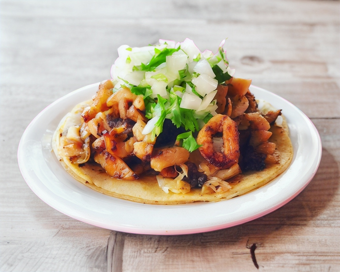 Taco campechaneado acompañado cebolla con cilantro, salsa verde, limones, salsas mexicana.