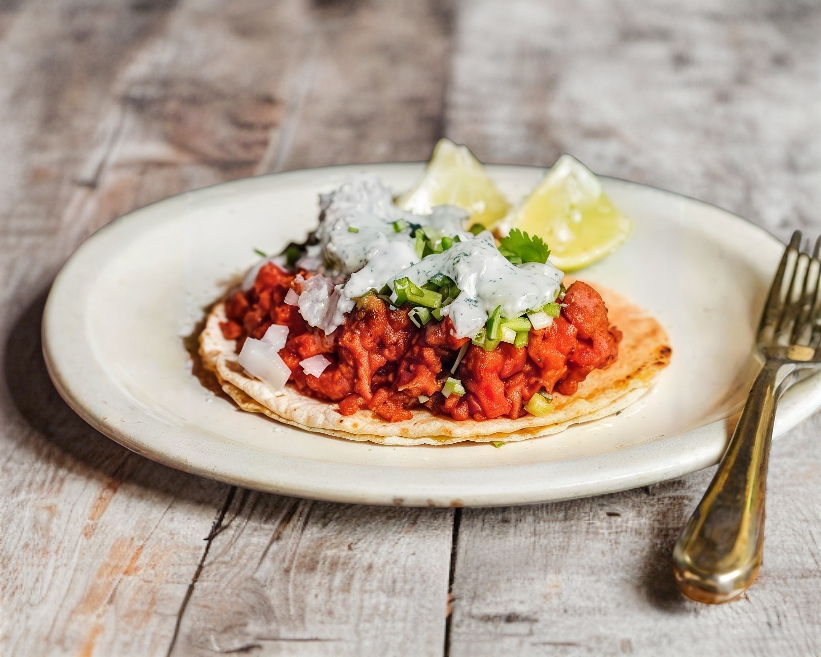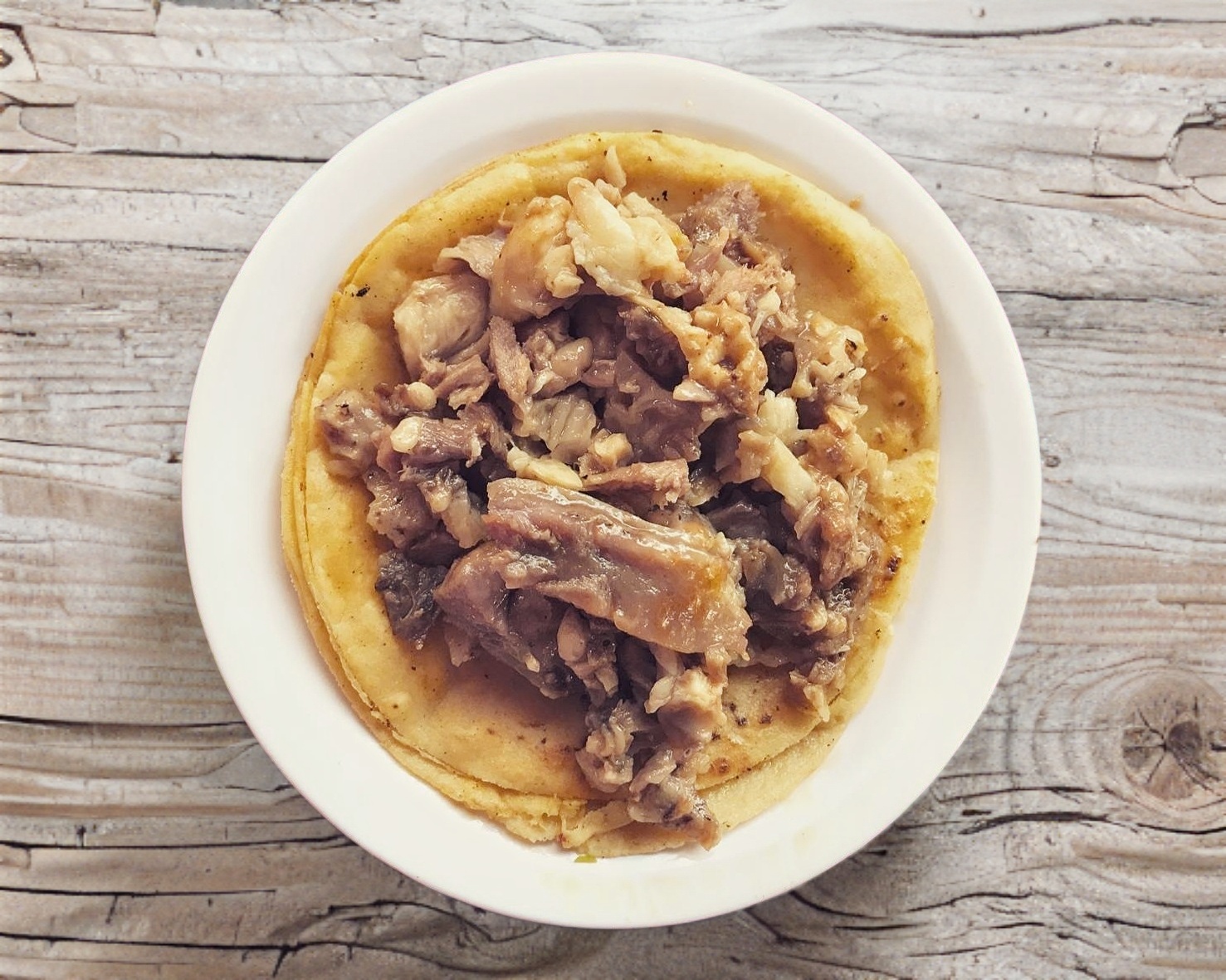 Gringa de tripa de res acompañada de cebolla, cilantro y salsas.