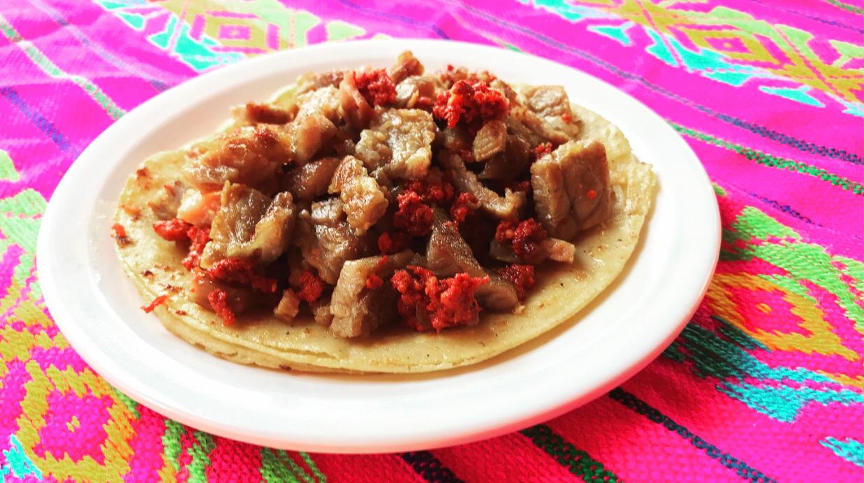 Taco de longaniza de res acompañado cebolla con cilantro, salsa verde, limones, salsas mexicana.