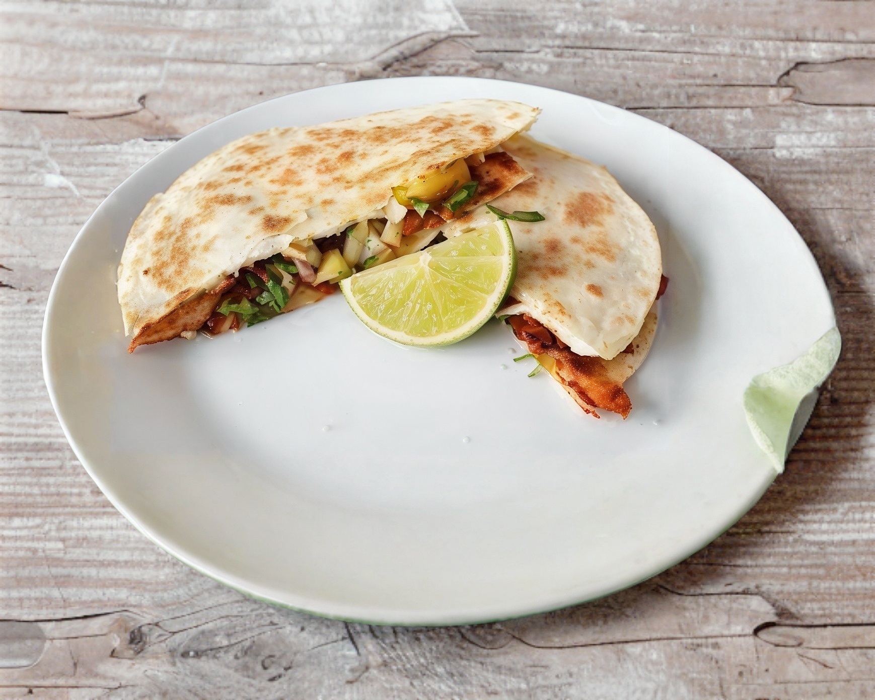 Gringa de asada de res acompañada de cebolla, cilantro y salsas.