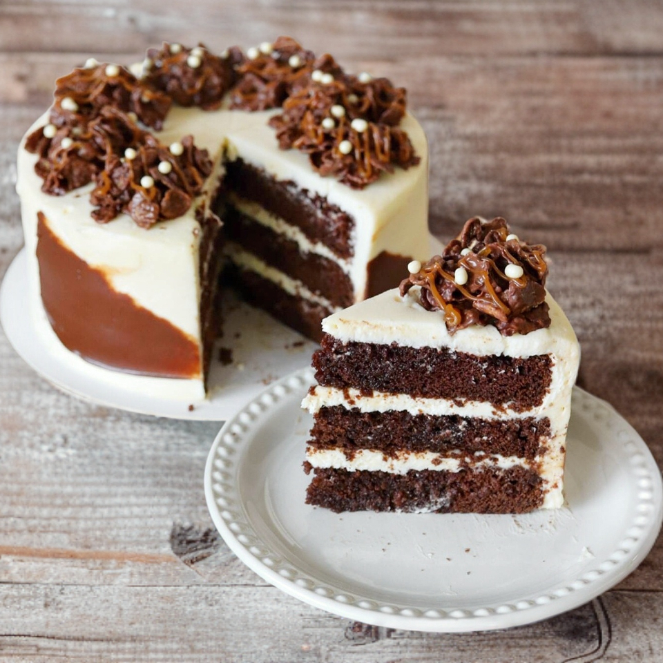 (2-3 porciones) Bizcocho semi-húmedo de chocolate con relleno de dulce de leche y betún de queso crema, cubierto de crema de chocolate y ganache de chocolate de leche.