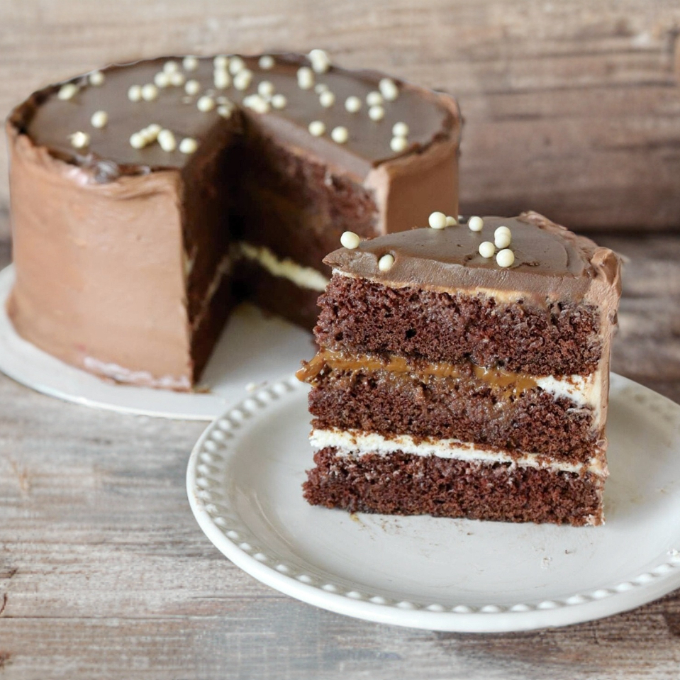Rebanada - Bizcocho semi-húmedo de chocolate con relleno de dulce de leche y betún de queso crema, cubierto de crema de chocolate y ganache de chocolate de leche.
