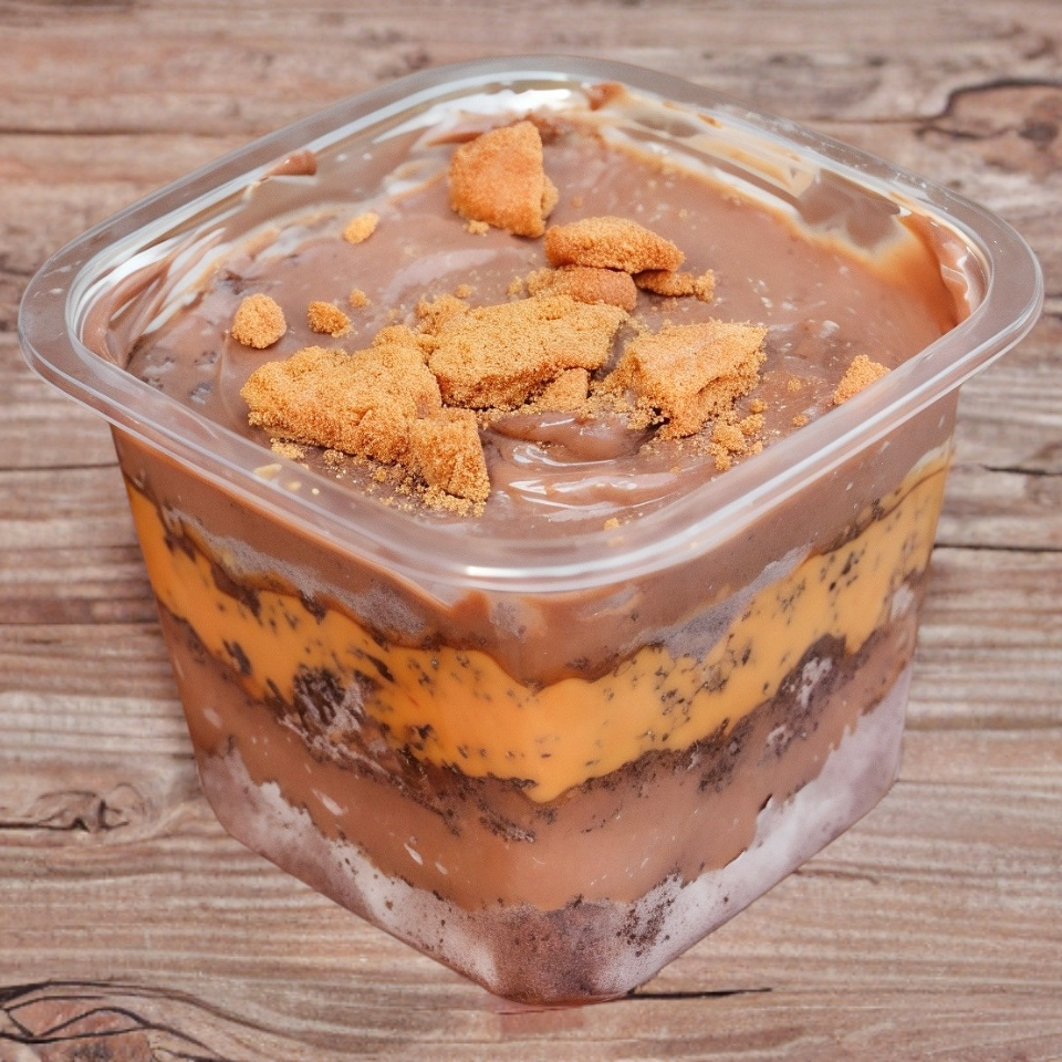 Cuchareable con capas de pastel de chocolate y crema de chocolate y caramelo salado.