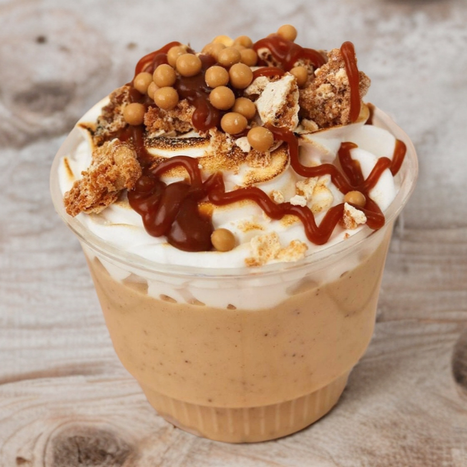 10 oz - Natilla de caramelo salado con crumbs de mostachón, merengue flameado y caramelo salado.