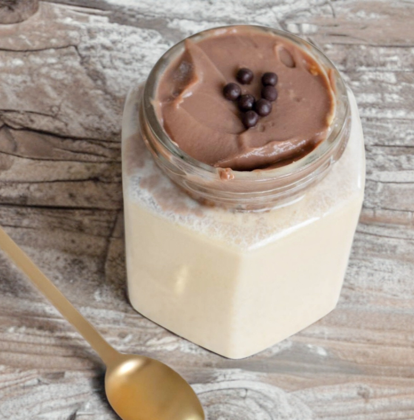 Frasco de 200 ml con queso napolitano de Edam y crema de chocolate.