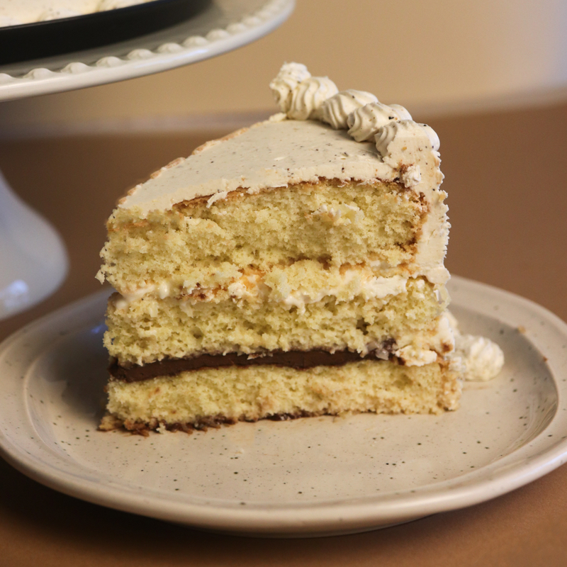 Rebanada - Bizcocho de vainilla en tres leches, nutella y crema de queso de bola, cubierto de buttercream flameado.
