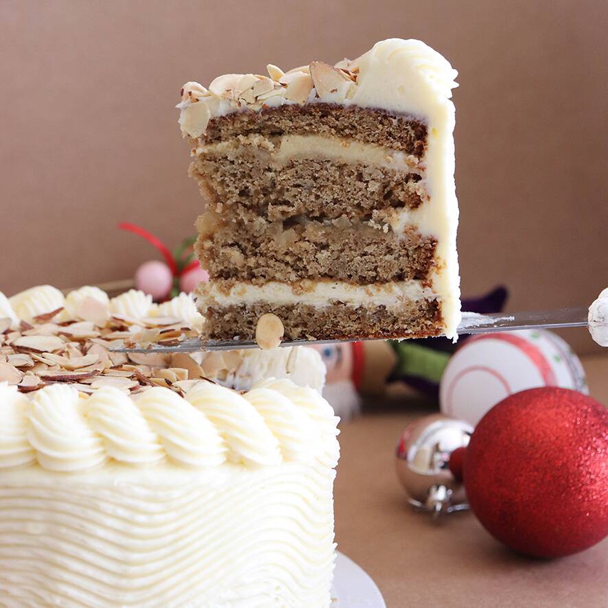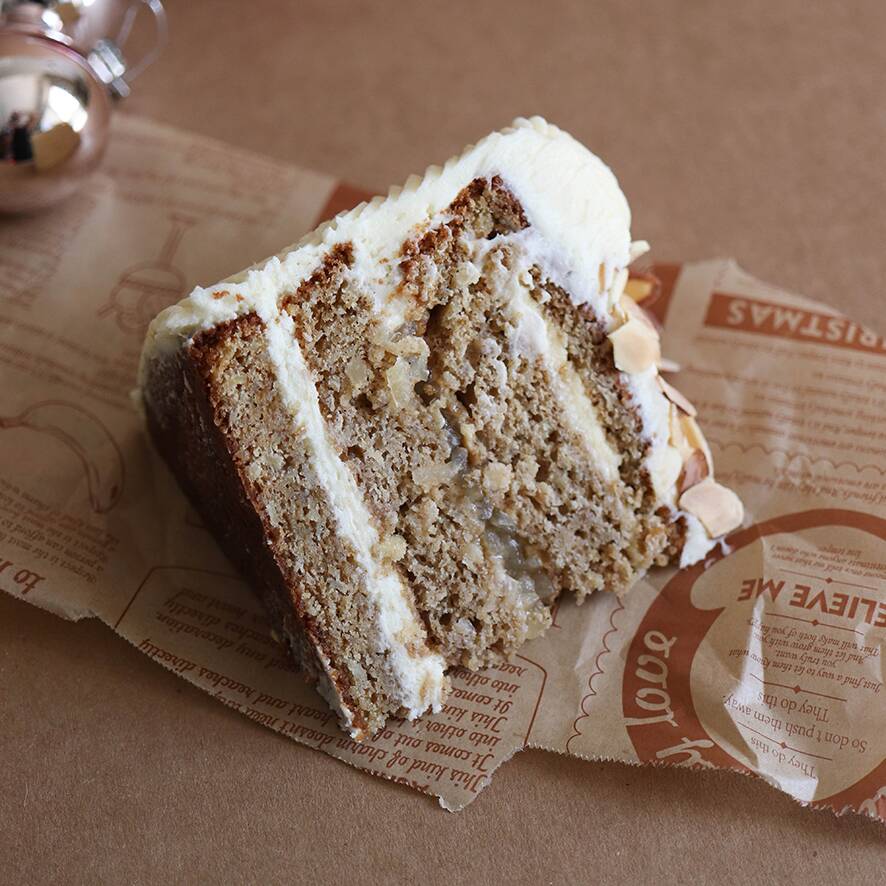 Rebanada - Nuestro pastel de zanahoria insignia con especias y nuez, betún de queso crema y nuez garapiñada.