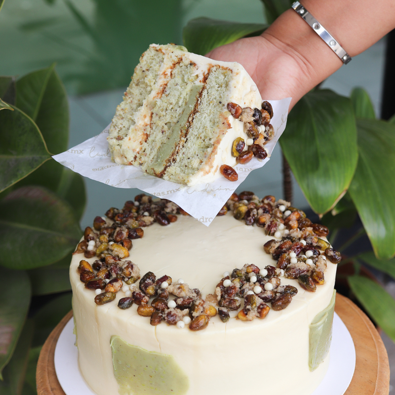 (3 porciones) - Bizcocho semi-húmedo de pistache con betún de chocolate blanco, Pistella (crema de pistache) y pistaches garapiñados.