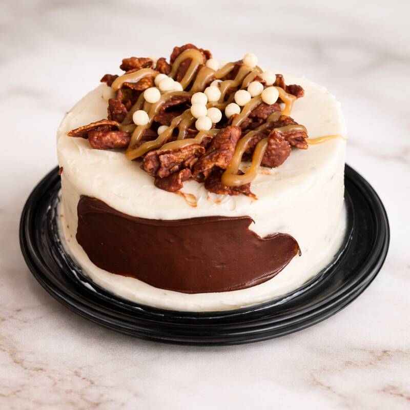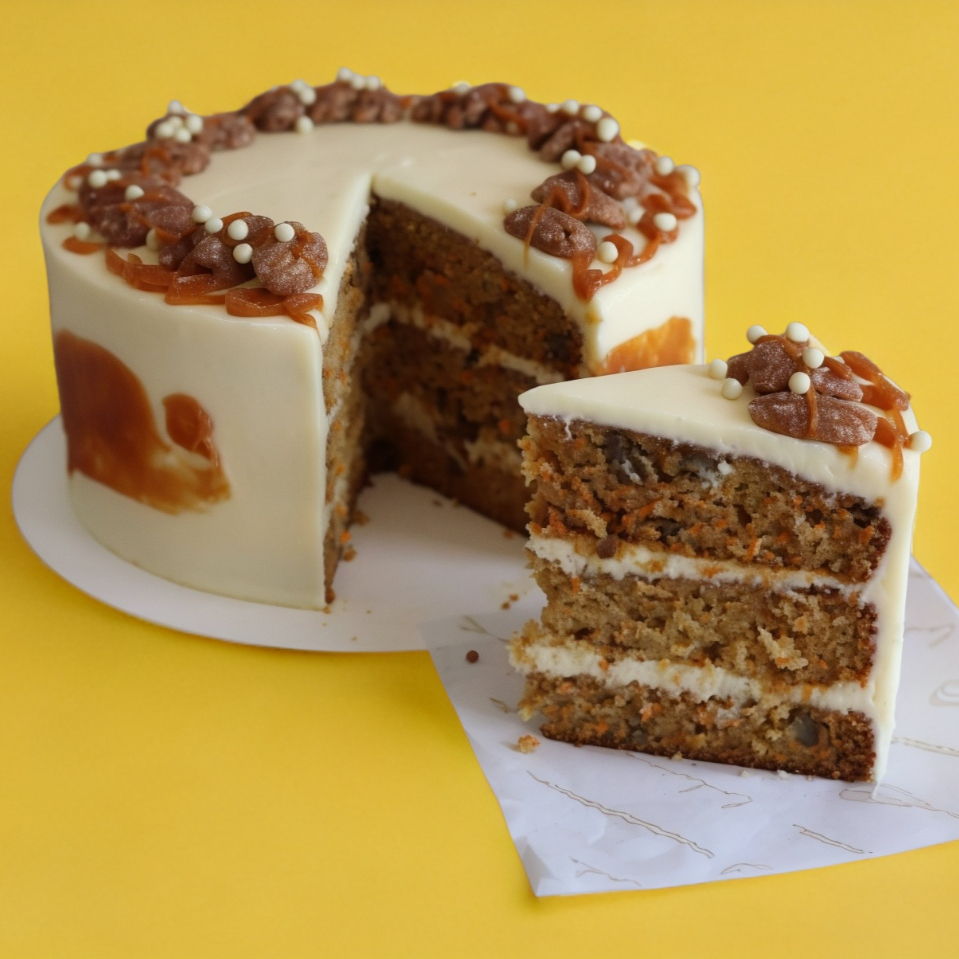 8-10 PORCIONES Nuestro pastel de zanahoria insignia con especias y nuez, betún de queso crema y nuez garapiñada.