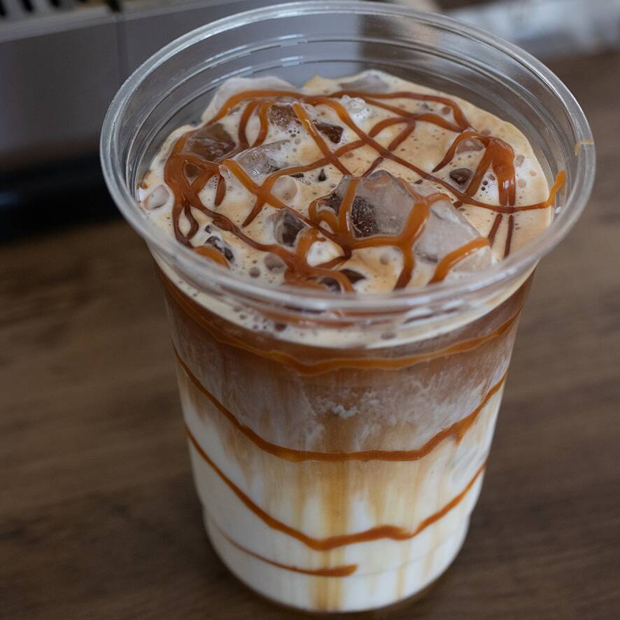 16 oz - Macchiato helado con syrup de vainilla y caramelo salado.