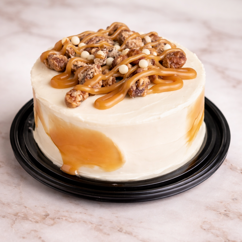 15-18 PORCIONES Nuestro pastel de zanahoria insignia con especias y nuez, betún de queso crema y nuez garapiñada.