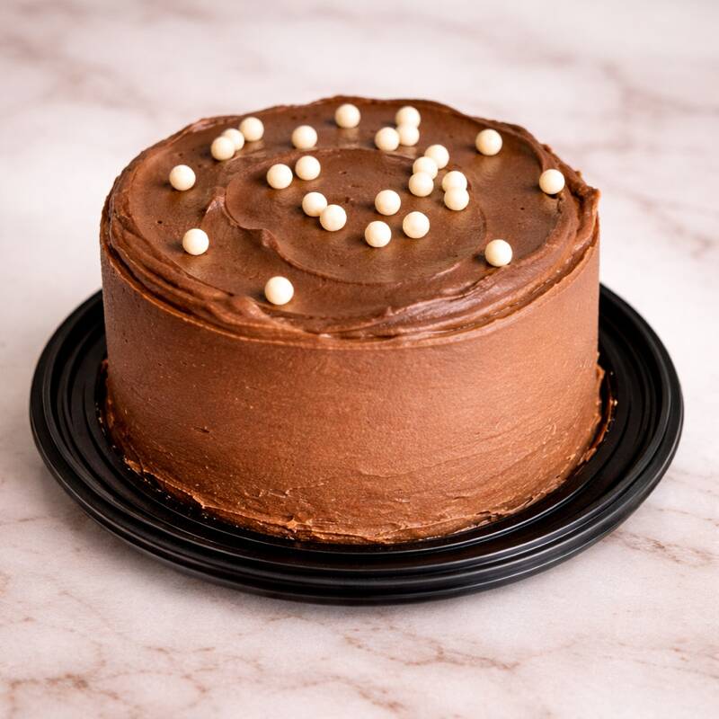15-18 PORCIONES Bizcocho semi-húmedo de chocolate con relleno de dulce de leche y betún de queso crema, cubierto de crema de chocolate y ganache de chocolate de leche.