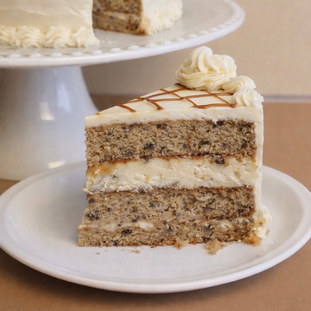 15-18 PORCIONES Bizcocho de plátano con nuez y trocitos de piña, centro de cheesecake cremoso y cubierto de betún de queso crema.