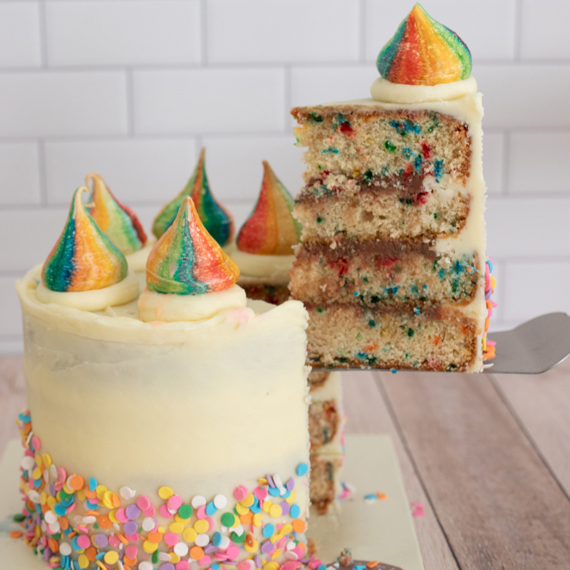 8-10 PORCIONES Bizcocho de vainilla con sprinkles de colores, relleno de betún de chocolate y decorado para cumpleaños.